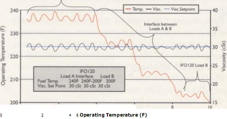 理解為什么混合物粘度有所不同負荷負荷只有一塊拼圖。結果如何理解不同的粘度是另一回事。不同等級的船用重油當形式層儲存在相同的儲油罐。作為一個結果,以維持粘度設置點、燃油的燃燒控制系統必須應對急劇變化時對燃油粘度變化之間的接口的掩體滿足燃油駁運泵抽吸。(見圖查看插入的一個例子IF0120不同負荷)。圖說明了一個相當大的變化IF0120粘度的層之間所負荷圖作為°°B。這需要改變粘度降低燃料溫度從240°F200°F為了保持粘度設置點上30 cst。認為會發生什么事假如操作者僅靠一個理論溫度設置點來自典型的燃料燃燒曲線。小費會犯規燃燒器更加頻繁的排放會受到不良影響。