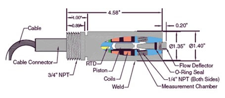位于活塞上方的導(dǎo)流裝置,將液體導(dǎo)入測量室,活塞持續(xù)運動以不斷更新樣品,同時機械摩擦不斷擦洗測量室。 一個內(nèi)置的RTD溫度測量探頭,實時測量測量室的溫度。